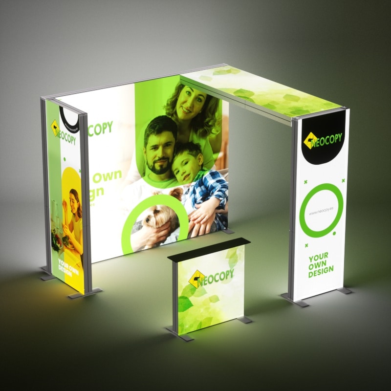 Stand Retroiluminable LED 3 x 2,5m – Kit Modular Doble con Muros en L y Mostrador