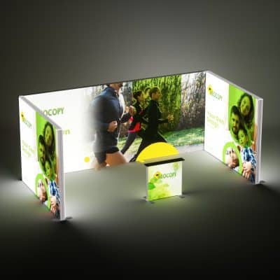 Stand Retroiluminable LED 3 x 2,5m – Kit Modular Triple con Muros Laterales y Mostrador